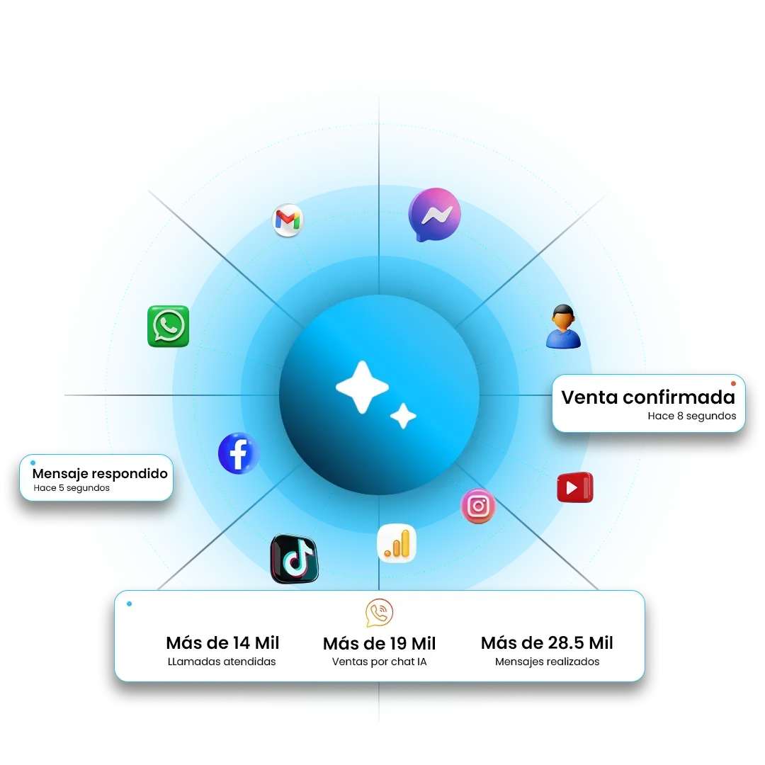 Centraliza todos tus leads, automatiza seguimientos, optimiza la comunicación y utiliza un agente con inteligencia artificial para responder en tiempo real, lo que se traduce en más conversiones, menos oportunidades perdidas y un aumento directo en ingresos.