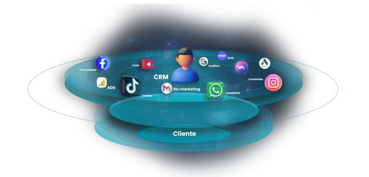Con tu propio embudo de ventas, página web, automatizaciónes, redes sociales, ADS, informes detaallados, conexion con cualquier App y un agente IA que convierte tráfico en clientes. Todo el roadmap de ventas con una sola herramienta.