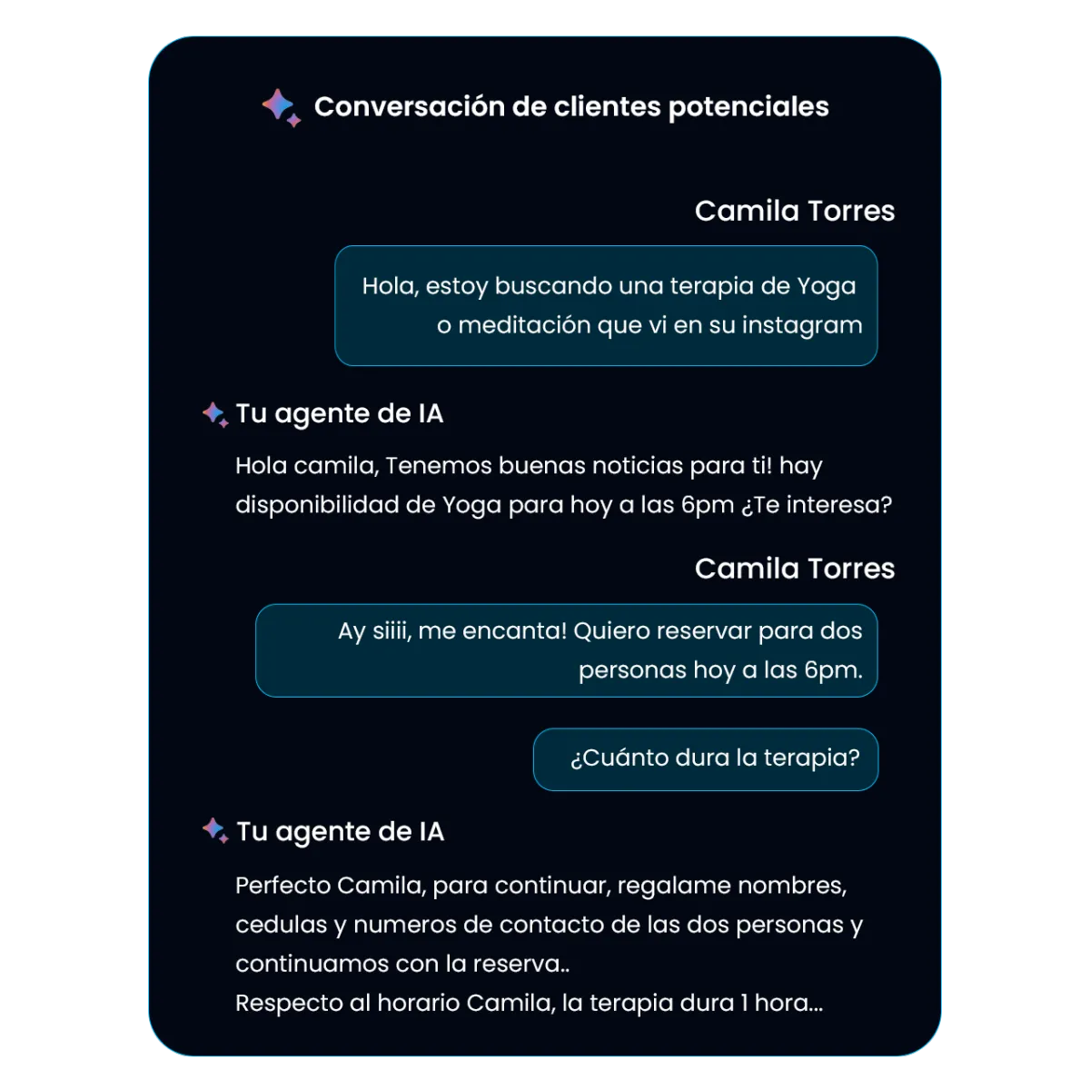 Responde mensajes, califica clientes, agenda citas, hace seguimiento y guía a las personas hasta la compra, ayudándote a no perder oportunidades y a aumentar tu conversión sin esfuerzo manual.